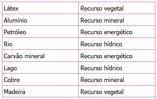 corretamente. Se necessário, explique novamente os tipos de recursos naturais
